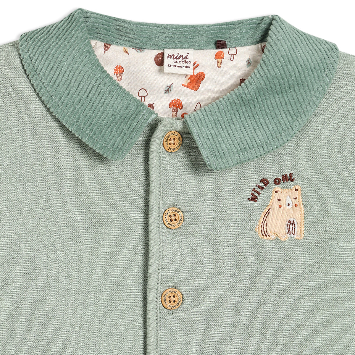 Keep your little explorer cosy and stylish with our Iceberg Green Barn Jacket – a charming blend of comfort, warmth, and woodland-inspired details. Crafted in soft cotton slub jacquard jersey with a quilted feel, this jacket is lightly padded and lined with playful Autumn Forage prints, bringing a touch of nature to everyday layering. Designed with a baby cord collar, wooden-look buttons, and handy patch pockets, it’s perfect for autumn walks, playdates, or gifting. The adorable “Wild One” bear embroidery adds a sweet finishing touch, making it a must-have piece for your little one’s wardrobe.