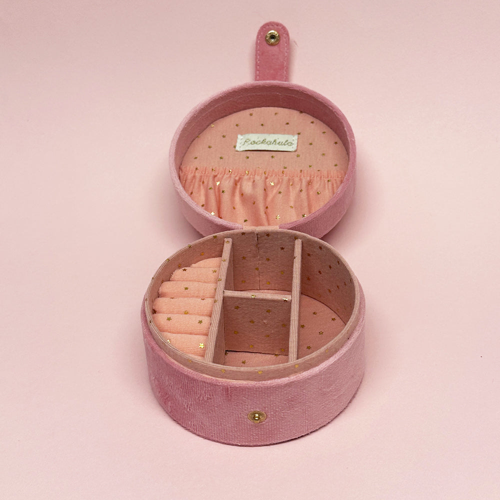 This lovely velvet jewellery box is the perfect place to keep all your Rockahula jewellery and favourite treasures safe! Featuring an embroidered pair of pink ballet slippers with satin ribbon detail, this jewellery box opens to reveal three compartments, a slip pocket and a dedicated space to slot earrings and rings. Lined with our starry fabric.